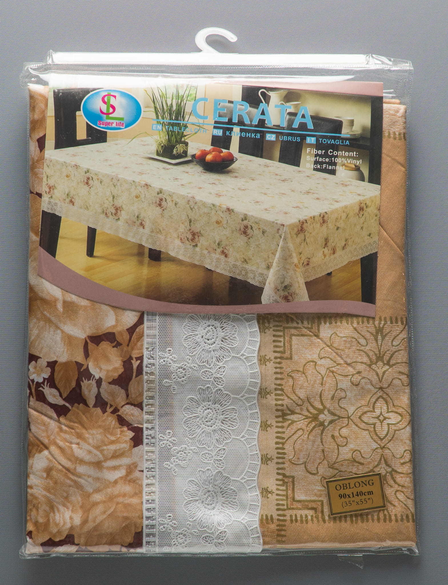 Obrus wykonany jest w 100% z winylu, natomiast tył obrusu jest zabezpieczony flanelą. Wykończony winylową koronką.
