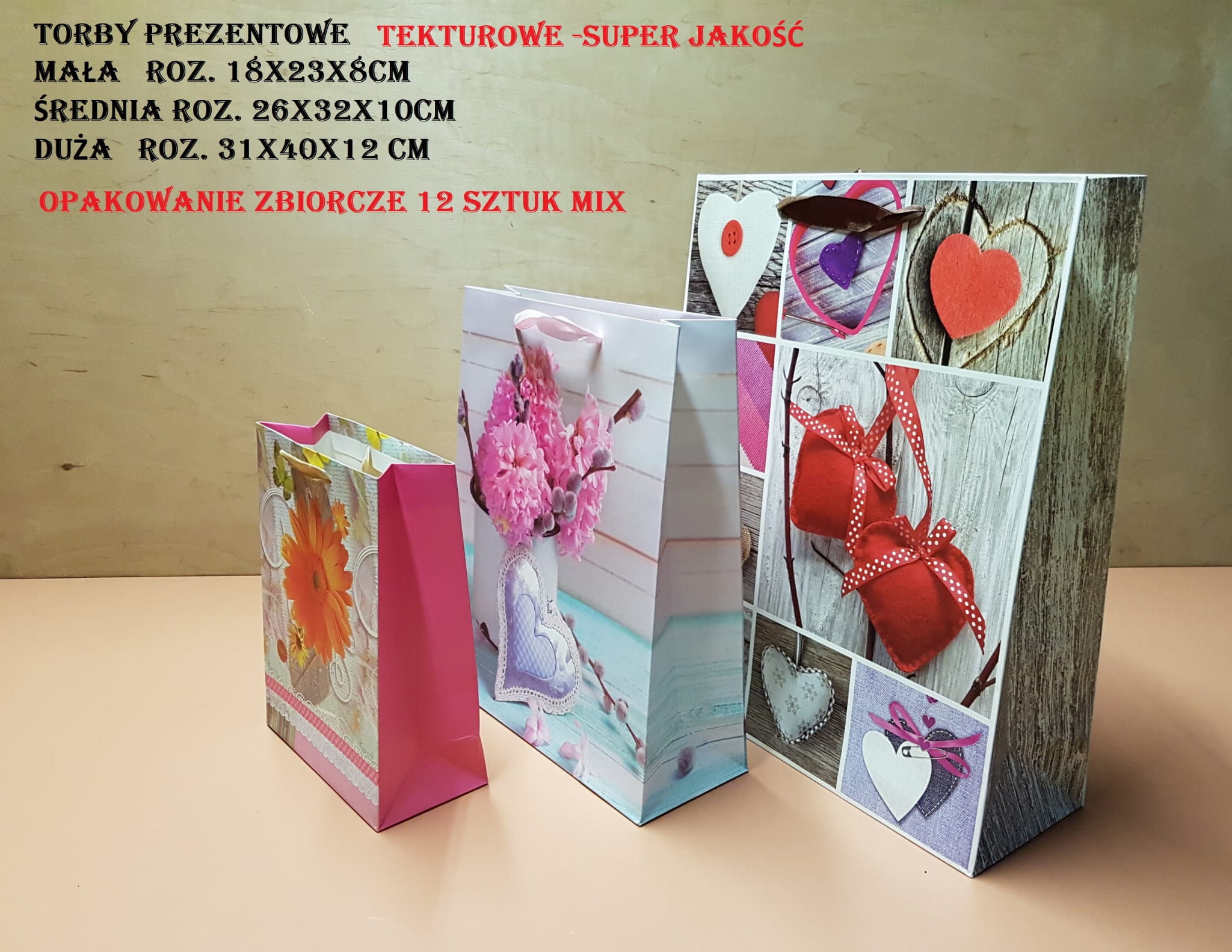 W ciągłej sprzedaży posiadamy trzy wielkości torebek prezentowych