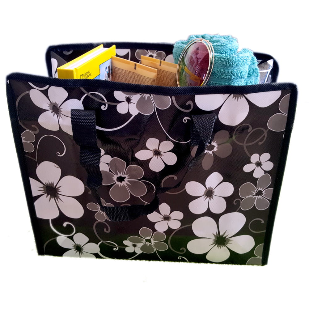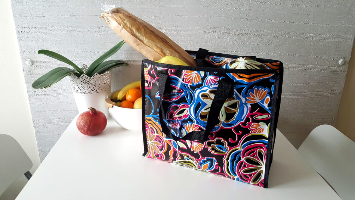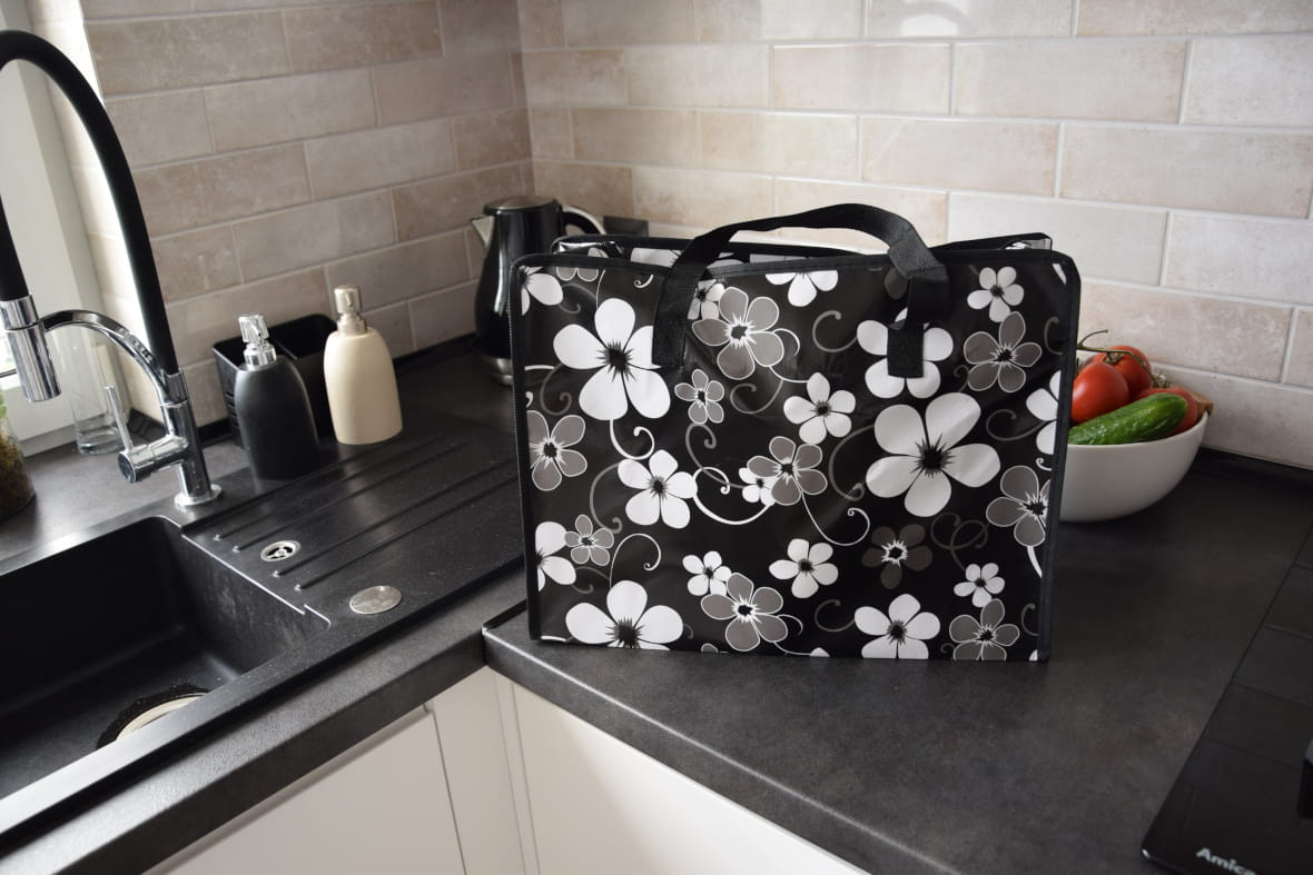 Praktyczna torba, z mocnego tworzywa, nieprzemakalna, w wielu modnych,kolorowych wzorach.