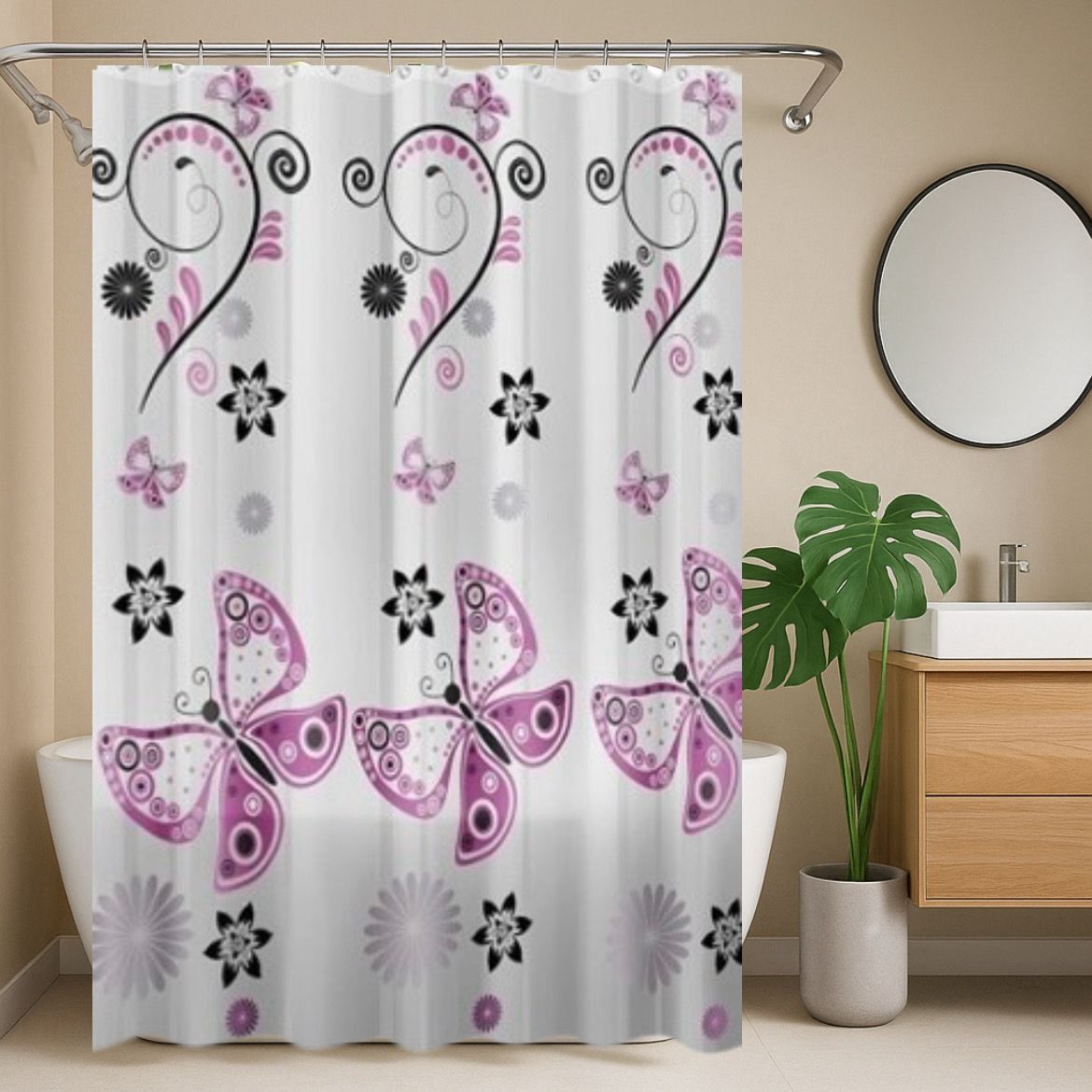 Wodoodporna zasłona prysznicowa wykonana z trwałej, lekkiej folii PEVA (polietylenowej). Idealna do ochrony łazienki przed zachlapaniem – szybko schnie, nie chłonie wilgoci i łatwo się ją czyści. W zestawie komplet 12 plastikowych kółek do zawieszenia (karabińczyków).